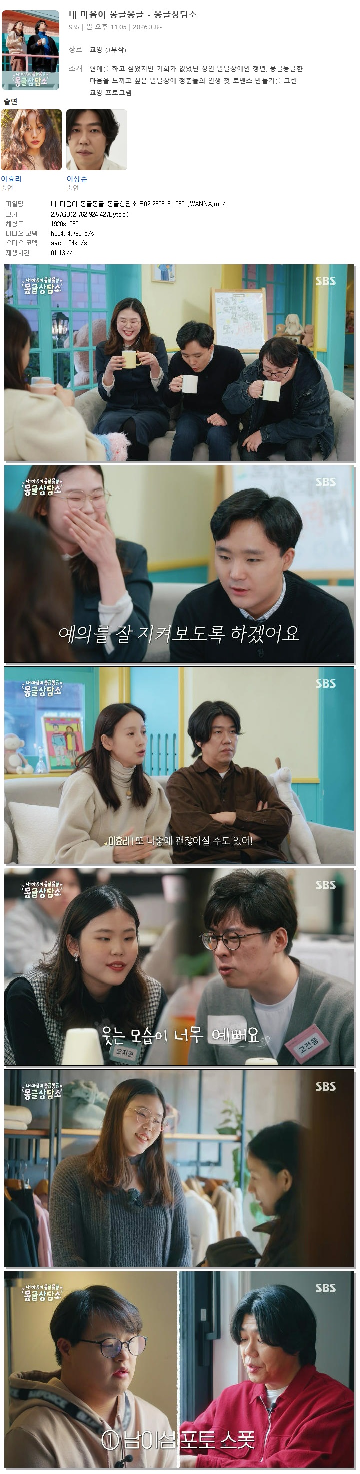 | [SBS] 내 마음이 몽글몽글 몽글상담소.E02.260315.1080p.WANNA[이효리, 이상순].mp4 | 2.6 G | 01:13:44 | 1920x1080 |