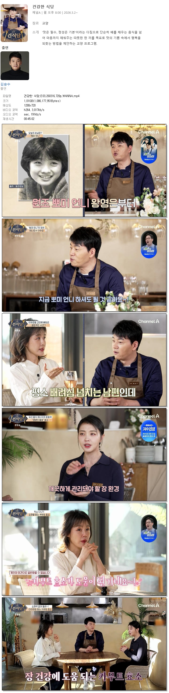 | [채널A] 건강한 식당.E03.260316.720p.WANNA[김승수].mp4 | 1 G | 00:45:02 | 1280x720 |