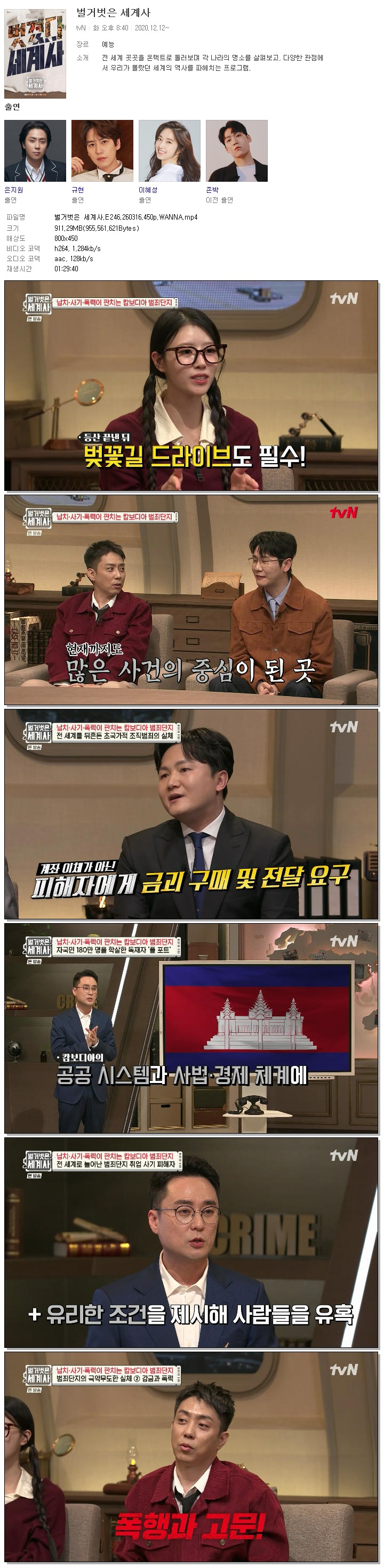 납치, 사기, 폭력이 판치는 캄보디아 범죄 단지. 보이스피싱부터 투자 리딩방, AI 기술을 이용한 로맨스 스캠까지! 전 세계를 노리는 온라인 사기 범죄가 끊임없이 쏟아져 나오는 캄보디아 범죄 단지! 그.런.데! 범죄 단지에서 잔혹한 폭력의 흔적이 남은 의문의 사건들이 잇따르고 있다?! 취업을 미끼로 사람들을 유인한 뒤 여권을 빼앗고 감금해 사기 범죄에 강제로 동원하고! 급기야 사람을 노예처럼 사고팔며 목숨까지 위협한다는데! 온갖 범죄가 뒤엉켜 탄생한 거대한 집합체! 캄보디아 범죄 단지의 충격적인 실체가 궁금하다면~.