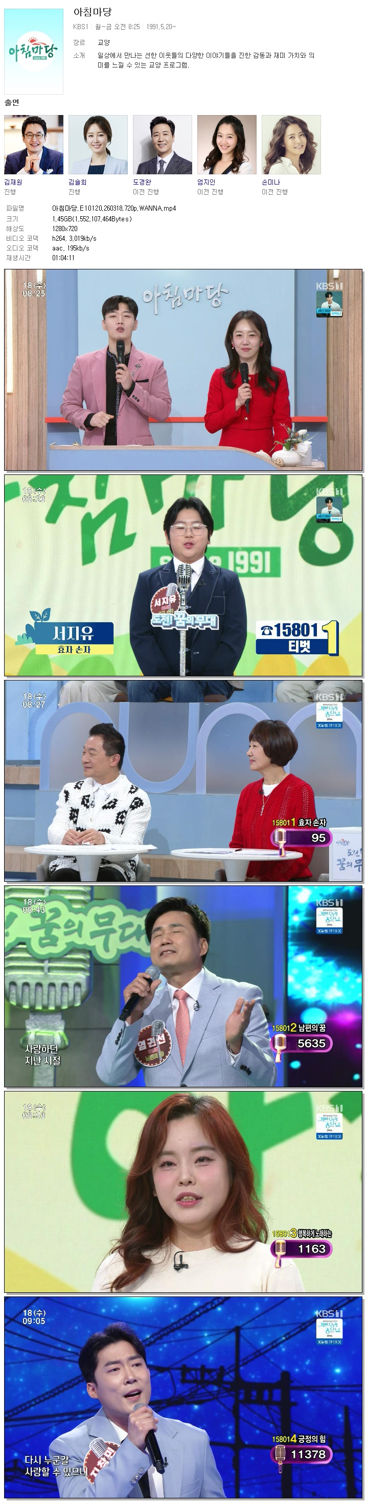 [KBS1] 아침마당.E10120.260318.720p.WANNA[김재원, 엄지인].mp4 1.4 G 01:04:11 1280x720