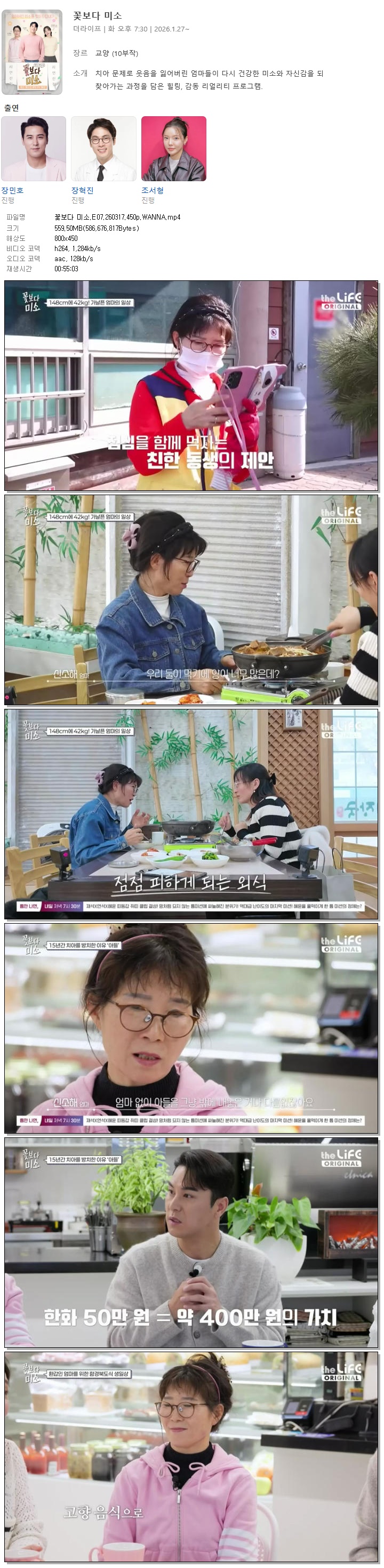 | [더라이프] 꽃보다 미소.E07.260317.450p.WANNA[장민호, 장혁진].mp4 | 559.5 M | 00:55:03 | 800x450 |