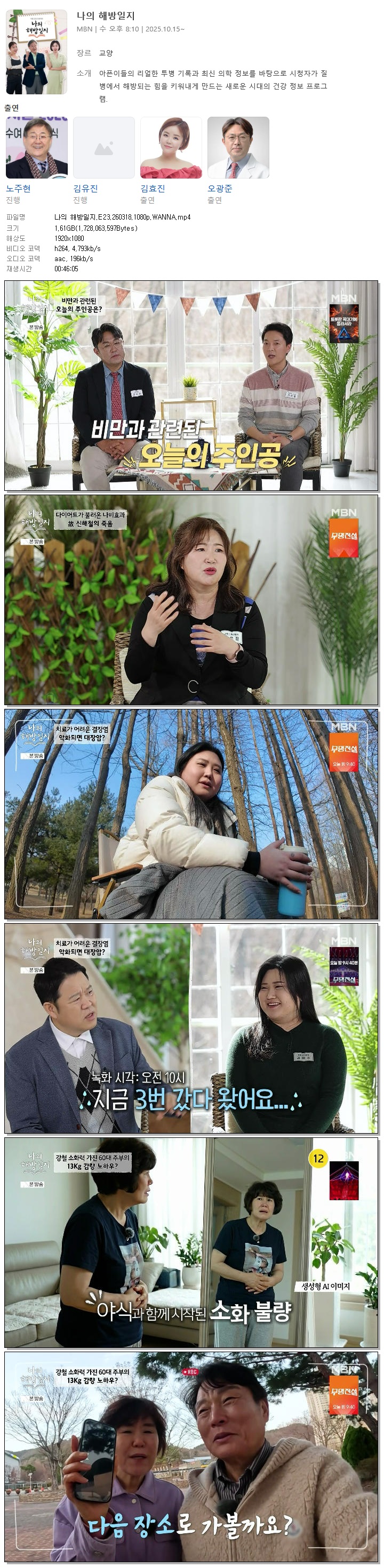 | [MBN] 나의 해방일지.E23.260318.1080p.WANNA[노주현, 김효진].mp4 | 1.6 G | 00:46:05 | 1920x1080 |