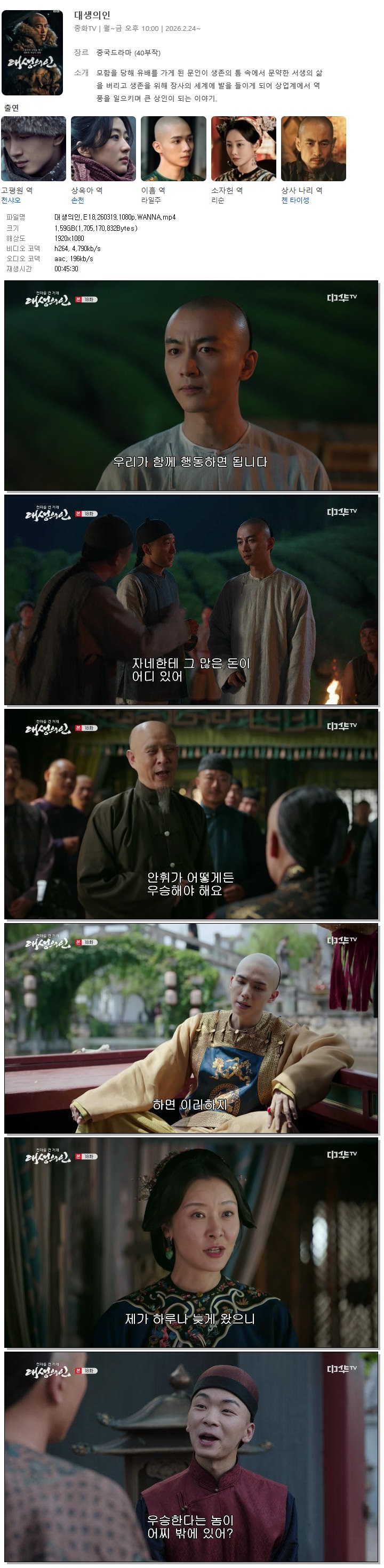 | [중화TV] 대생의인.E18.260319.1080p.WANNA[천샤오, 손천].mp4 | 1.6 G | 00:45:30 | 1920x1080 |