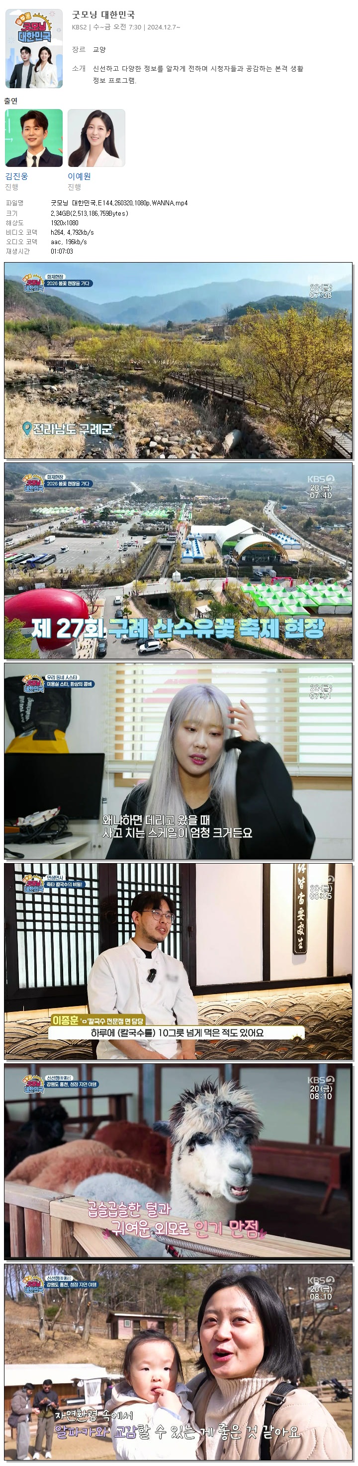 | [KBS2] 굿모닝 대한민국.E144.260320.1080p.WANNA[김진웅, 이예원].mp4 | 2.3 G | 01:07:03 | 1920x1080 |