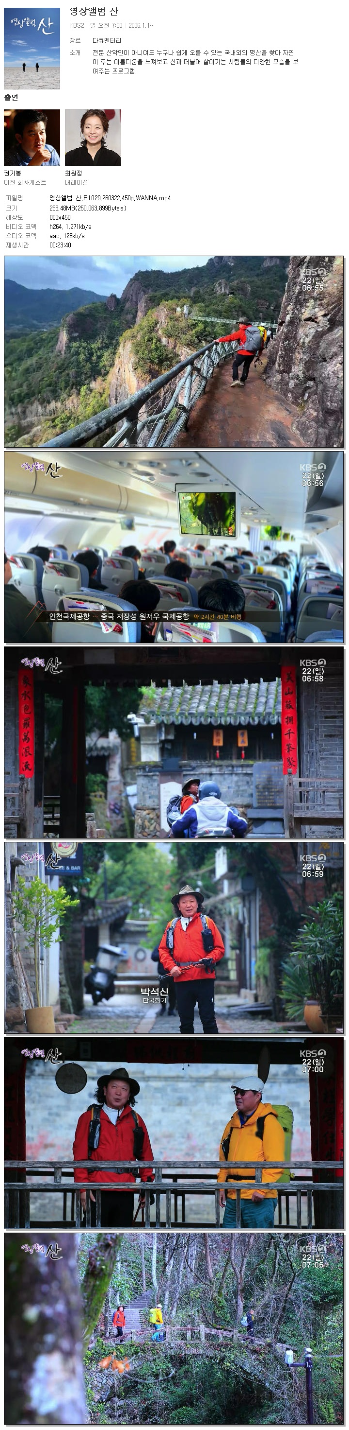 | [KBS2] 영상앨범 산.E1029.260322.450p.WANNA.mp4 | 238.5 M | 00:23:40 | 800x450 |