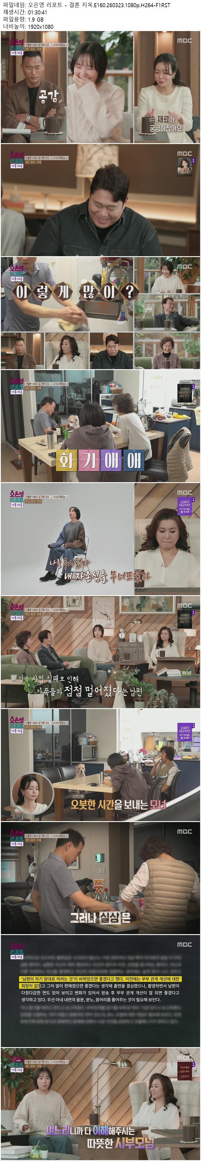 | 오은영 리포트 - 결혼 지옥.E160.260323.1080p.H264-F1RST.mp4 | 1.9 G | 01:30:41 | 1920x1080 |