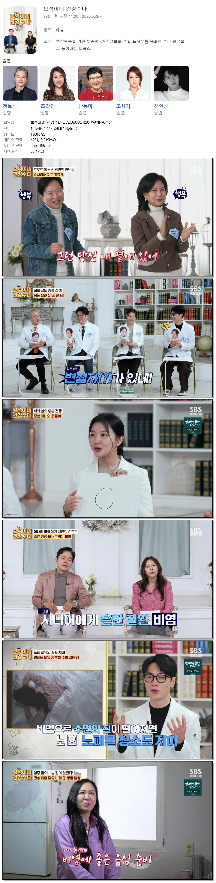 | [SBS] 보석이네 건강수다.E39.260330.720p.WANNA[정보석, 조갑경].mp4 | 1.1 G | 00:47:33 | 1280x720 |