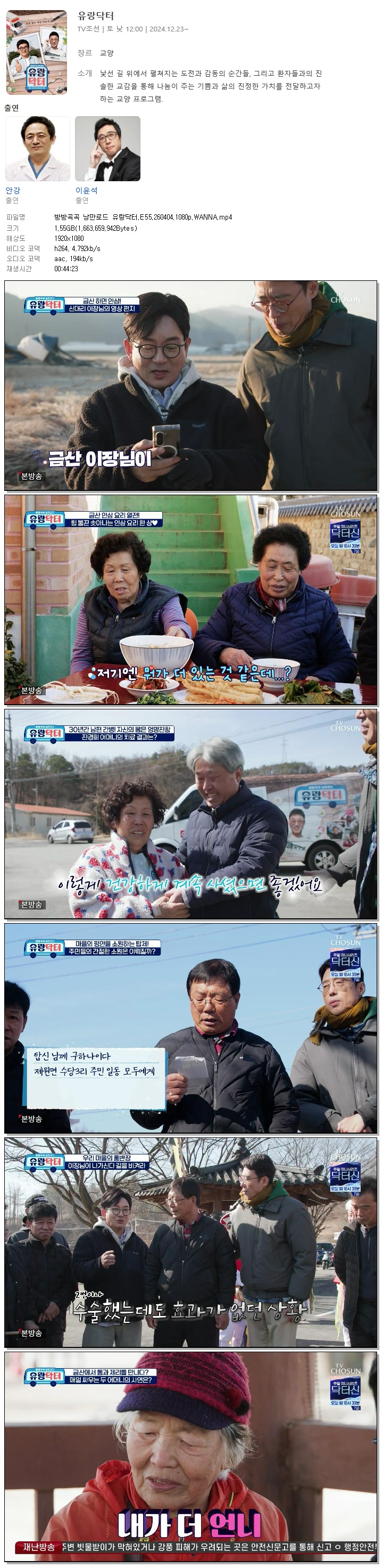 | [TV조선] 방방곡곡 낭만로드 유랑닥터.E55.260404.1080p.WANNA[안강, 이윤석].mp4 | 1.5 G | 00:44:23 | 1920x1080 |