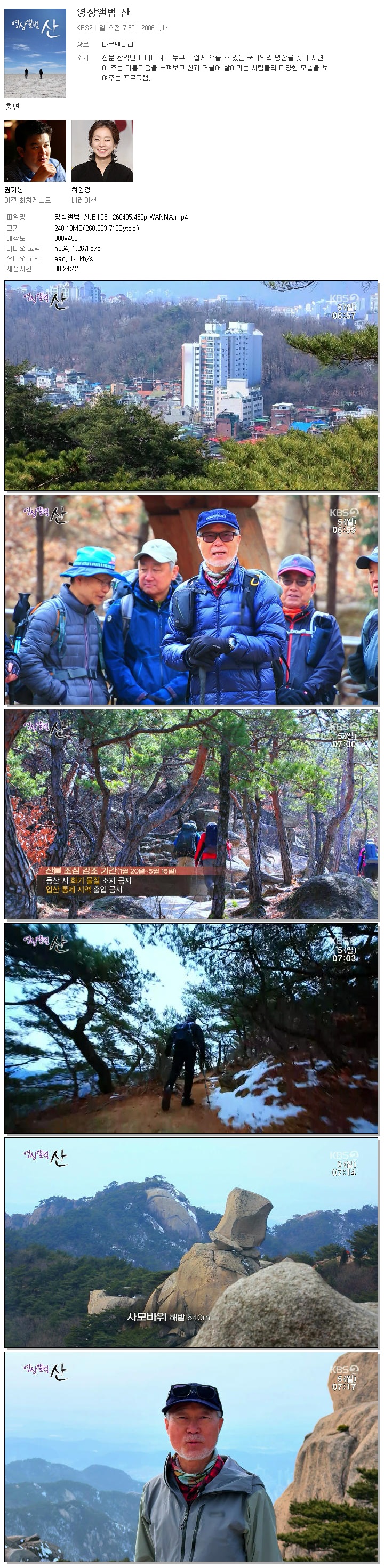 | [KBS2] 영상앨범 산.E1031.260405.450p.WANNA.mp4 | 248.2 M | 00:24:42 | 800x450 |