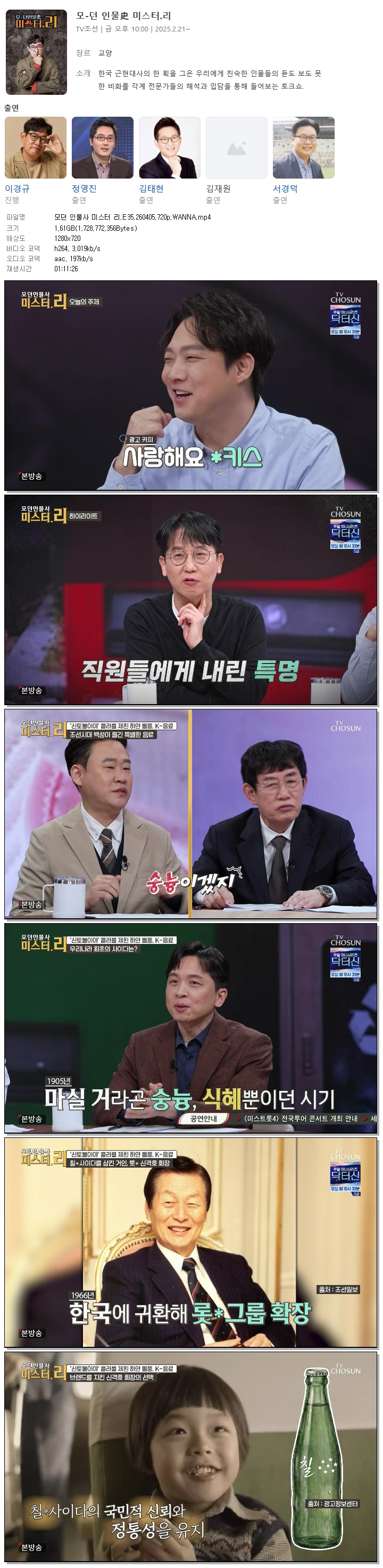 | [TV조선] 모던 인물사 미스터 리.E35.260405.720p.WANNA[이경규].mp4 | 1.6 G | 01:11:26 | 1280x720 |