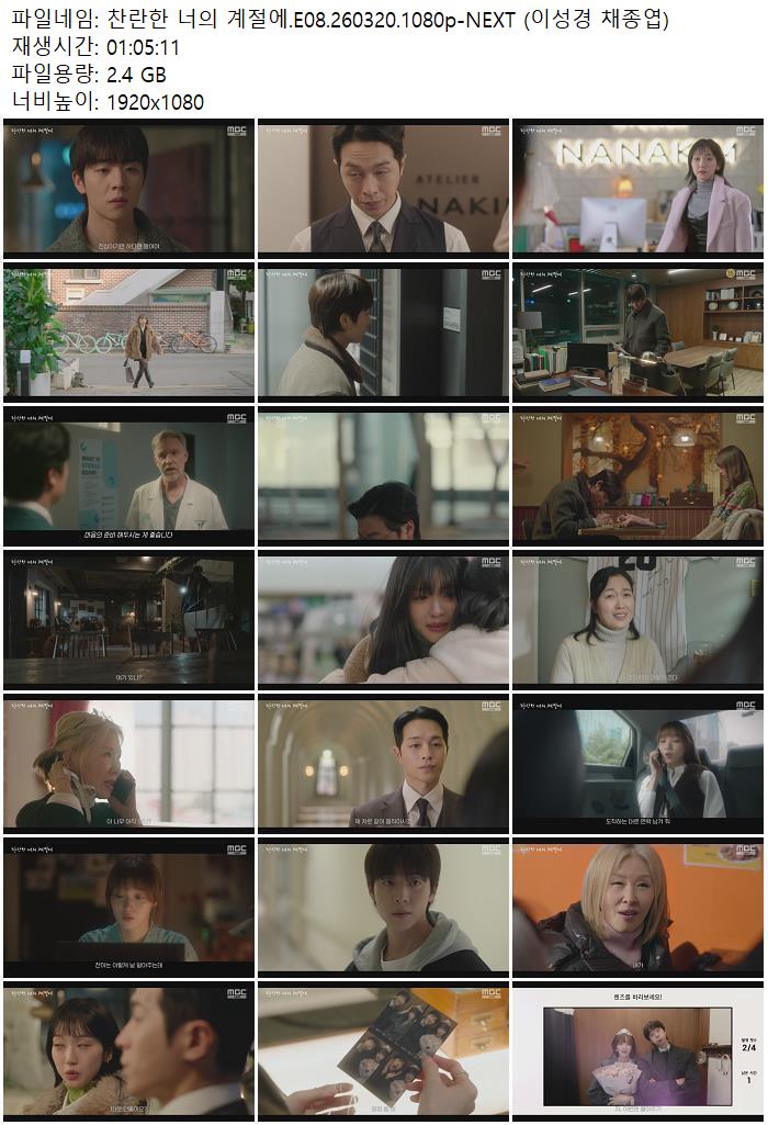 | 찬란한 너의 계절에.E08.260320.1080p-NEXT (이성경 채종엽).mp4 | 2.4 G | 01:05:00 | 1920x1080 |