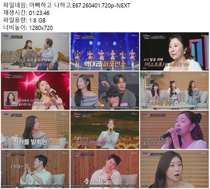 | 아빠하고 나하고.E67.260401.720p-NEXT.mp4 | 1.8 G | 01:23:00 | 1280x720 |