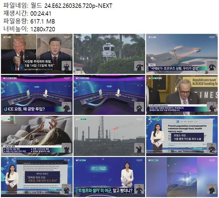 | 월드 24.E62.260326.720p-NEXT.mp4 | 617.1 M | 00:24:41 | 1280x720 |