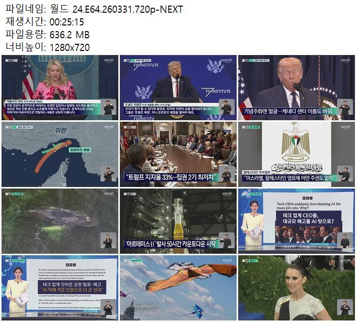 | 월드 24.E64.260331.720p-NEXT.mp4 | 636.2 M | 00:25:15 | 1280x720 |