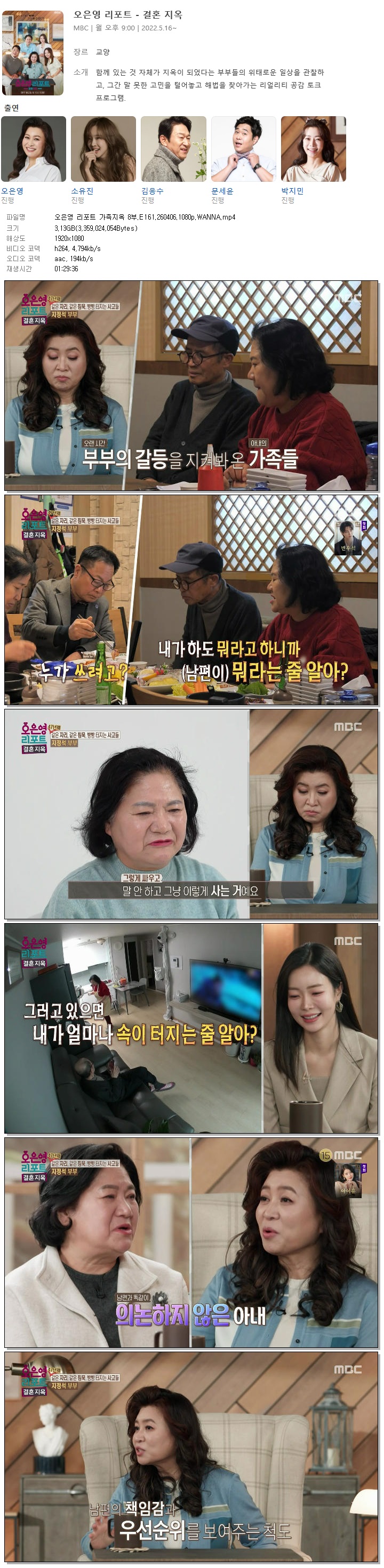 | [MBC] 오은영 리포트 가족지옥 8부.E161.260406.1080p.WANNA[오은영, 문세윤].mp4 | 3.1 G | 01:29:36 | 1920x1080 |