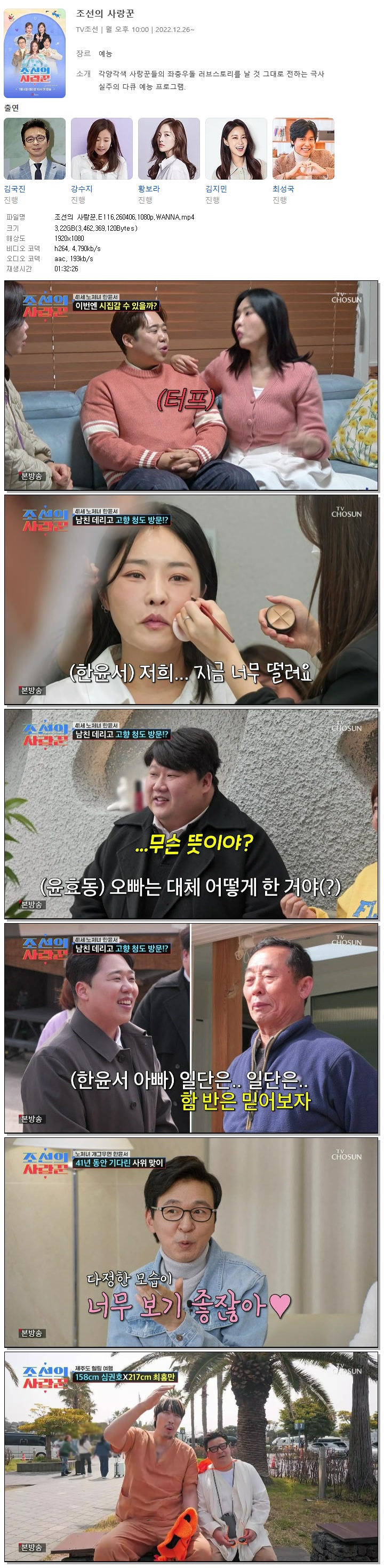 | [TV조선] 조선의 사랑꾼.E116.260406.1080p.WANNA[인순이, 한윤서].mp4 | 3.2 G | 01:32:26 | 1920x1080 |