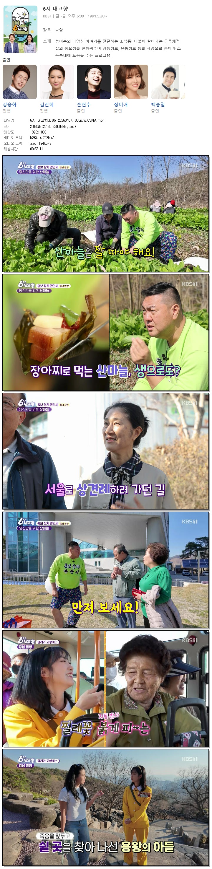 | [KBS1] 6시 내고향.E8512.260407.1080p.WANNA[강승화, 김진희].mp4 | 2 G | 00:58:11 | 1920x1080 |
