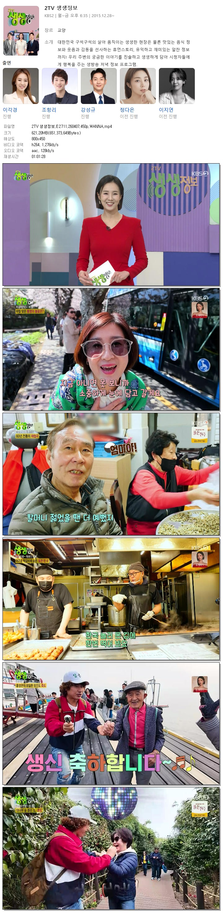 | [KBS2] 2TV 생생정보.E2711.260407.450p.WANNA[이각경, 조항리].mp4 | 621.2 M | 01:01:28 | 800x450 |