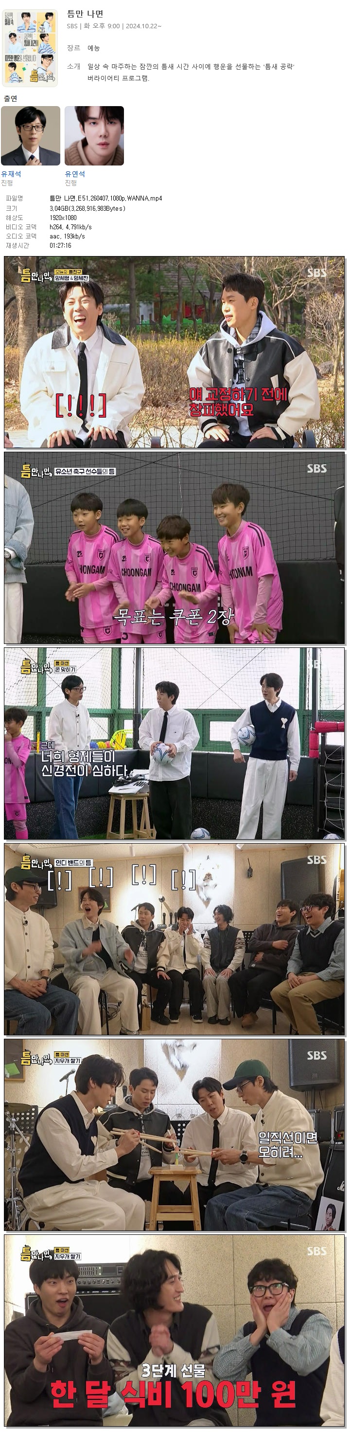 | [SBS] 틈만 나면.E51.260407.1080p.WANNA[양세형, 양세찬].mp4 | 3 G | 01:27:16 | 1920x1080 |