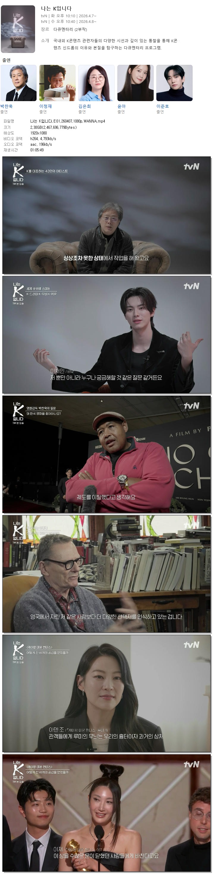 [TVN] 나는 K입니다.E01.260407.1080p.WANNA.mp4 2.3 G 01:05:49 1920x1080