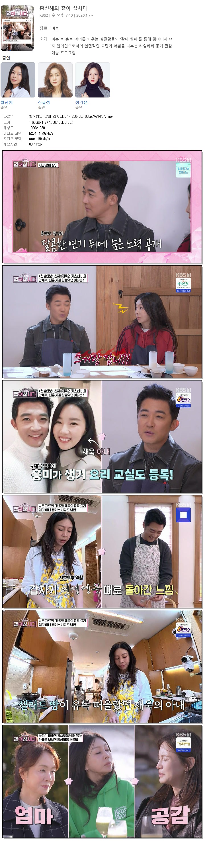 | [KBS1] 황신혜의 같이 삽시다.E14.260408.1080p.WANNA[안재욱].mp4 | 1.7 G | 00:47:26 | 1920x1080 |