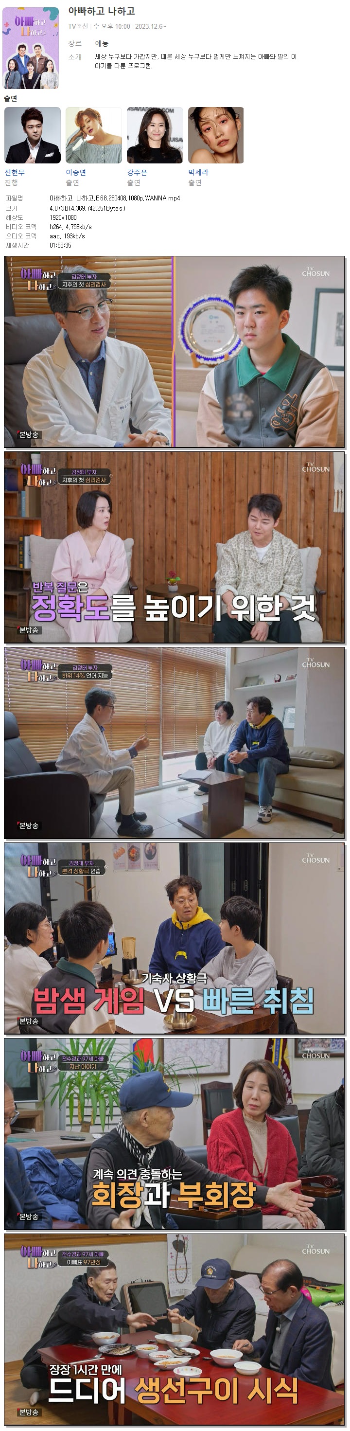 | [TV조선] 아빠하고 나하고.E68.260408.1080p.WANNA[허찬미, 전수경].mp4 | 4.1 G | 01:56:35 | 1920x1080 |