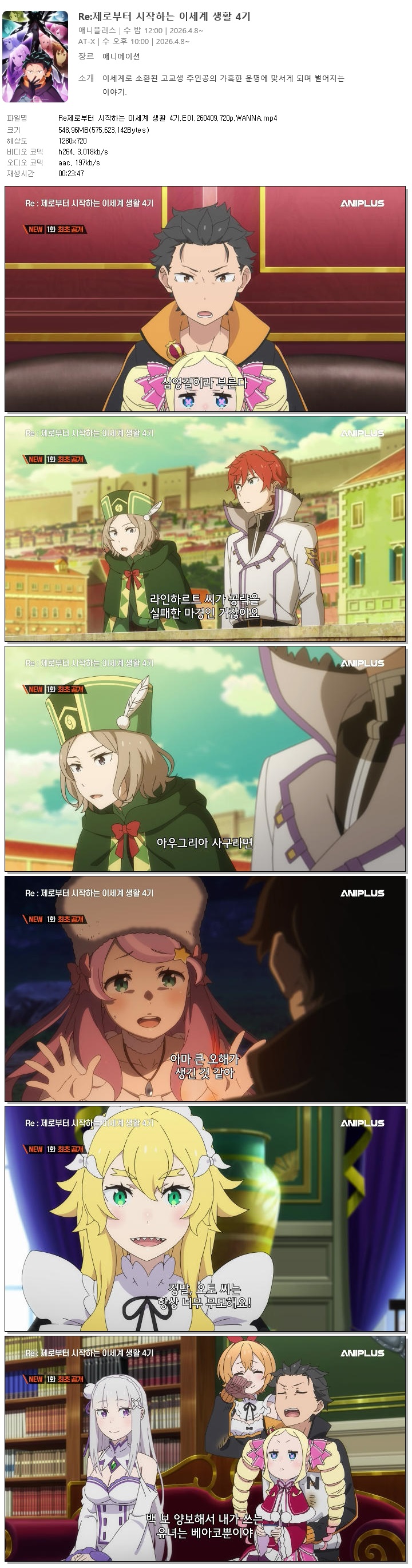 | Re제로부터 시작하는 이세계 생활 4기.E01.260409.720p.WANNA.mp4 | 549 M | 00:23:47 | 1280x720 |