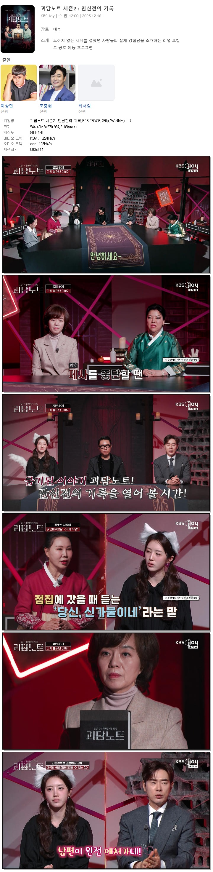| [KBS JOY] 괴담노트 시즌2 만신전의 기록.E15.260408.450p.WANNA[이상민, 조충현].mp4 | 544.5 M | 00:53:14 | 800x450 |