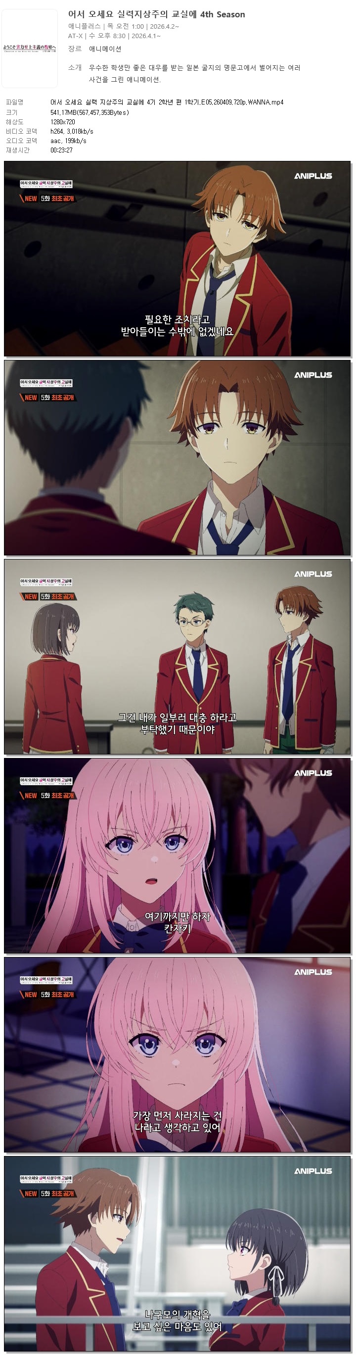 | 어서 오세요 실력 지상주의 교실에 4기 2학년 편 1학기.E05.260409.720p.WANNA.mp4 | 541.2 M | 00:23:27 | 1280x720 |