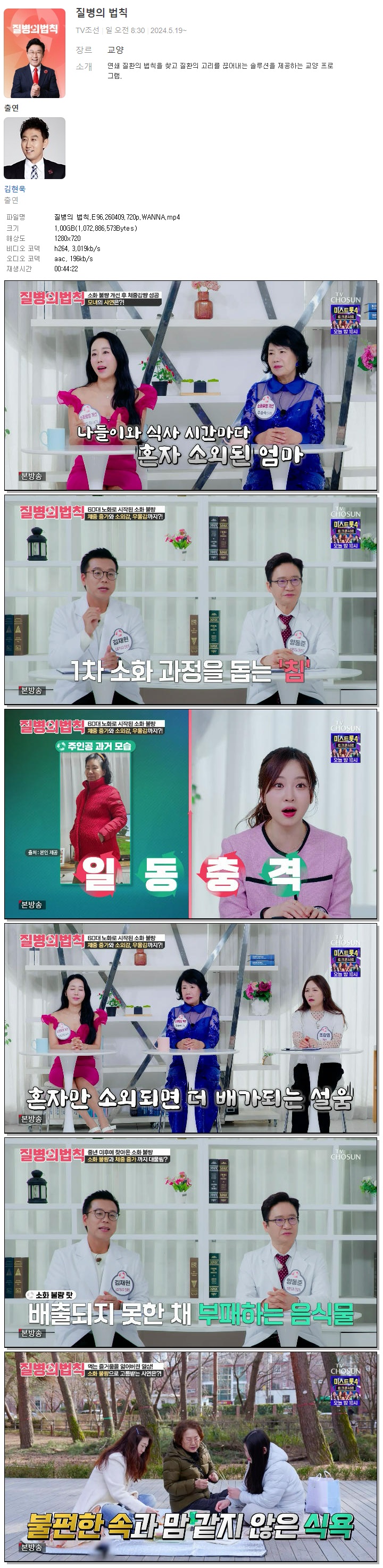 | [TV조선] 질병의 법칙.E96.260409.720p.WANNA[김현욱].mp4 | 1023.2 M | 00:44:22 | 1280x720 |