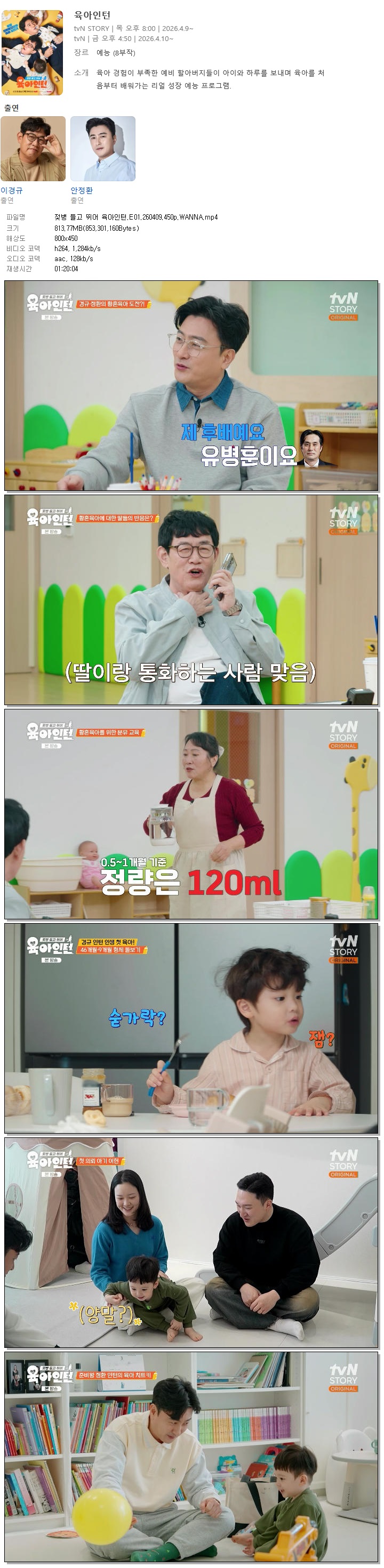 | [TVN STORY] 젖병 들고 뛰어 육아인턴.E01.260409.450p.WANNA[이경규, 안정환].mp4 | 813.8 M | 01:20:04 | 800x450 |