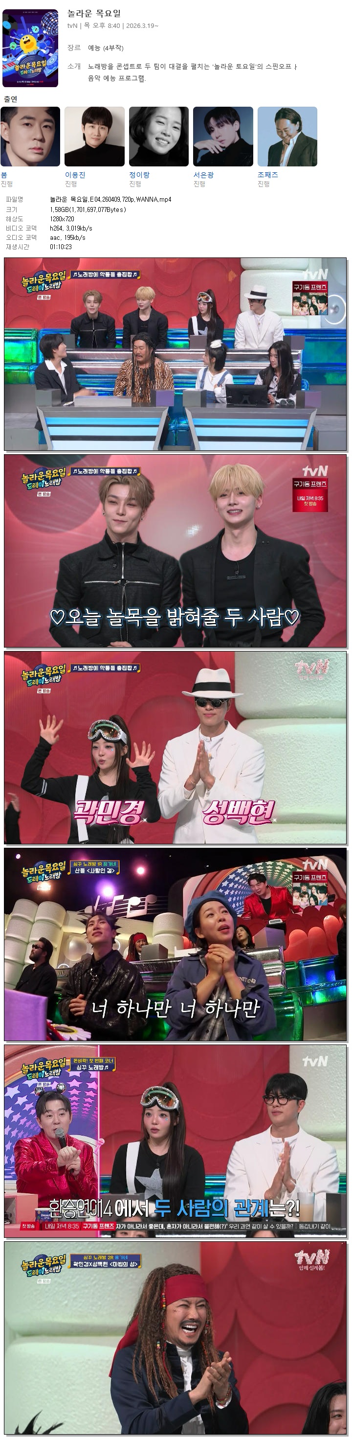 | [TVN] 놀라운 목요일.E04.260409.720p.WANNA[정이랑, 조째즈].mp4 | 1.6 G | 01:10:23 | 1280x720 |