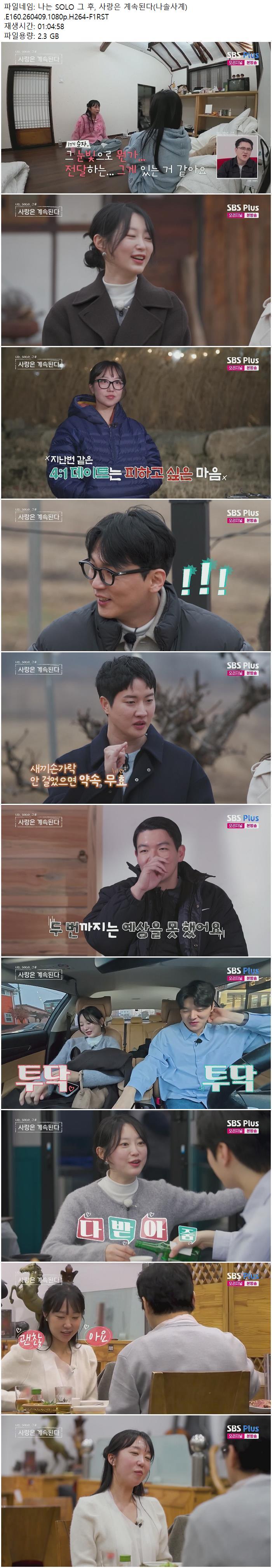 | 나는 SOLO 그 후, 사랑은 계속된다(나솔사계).E160.260409.1080p.H264-F1RST.mp4 | 2.3 G | 01:04:58 | 1920x1080 |
