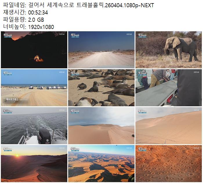| 걸어서 세계속으로 트래블홀릭.260404.1080p-NEXT.mp4 | 2 G | 00:52:34 | 1920x1080 |