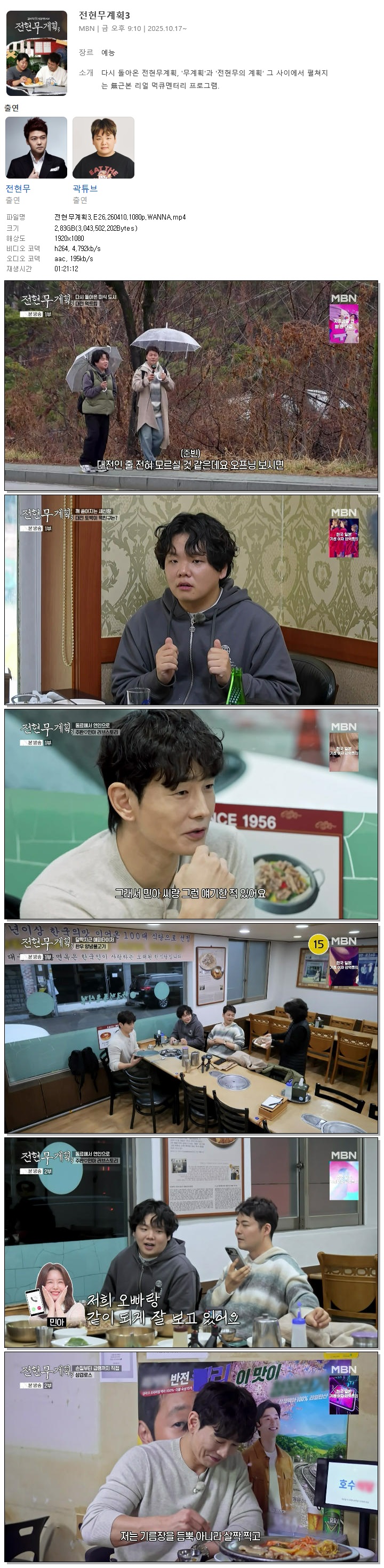 | [MBN] 전현무계획3.E26.260410.1080p.WANNA[온주완].mp4 | 2.8 G | 01:21:12 | 1920x1080 |