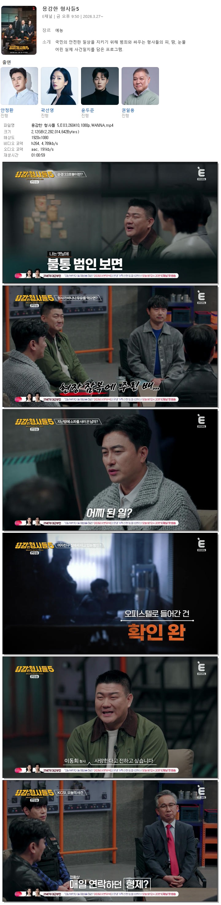 | [E채널] 용감한 형사들 5.E03.260410.1080p.WANNA[안정환, 곽선영].mp4 | 2.1 G | 01:00:59 | 1920x1080 |