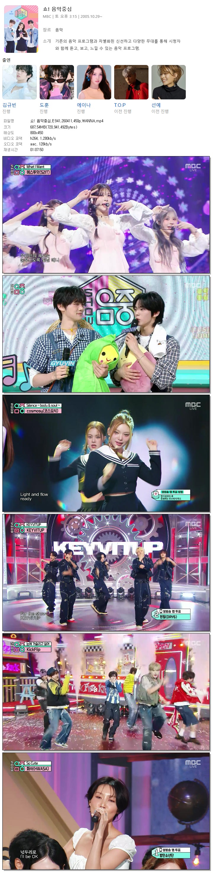 ♬ Comeback ♥ Stage ♬ · 강렬한 사운드로 잠들어있던 감성을 깨우는 하드코어 록의 최강자 닥터코어911! - 닥터코어911『PK2』 · 감미로운 보컬과 여운이 남는 노랫말로 리스너들의 마음에 깊은 파장을 일으킬 정승환! - 정승환『앞머리』 · 강렬하고 매혹적인 퍼포먼스로 다시 한번 빛나는 존재감을 각인시킬 원호! - 원호『if you wanna』 · 처음 맛보는 음악으로 글로벌 팬들의 마음을 단번에 사로잡을 DKZ! - DKZ『Replay My Anthem』 · 위아이(WEi)가 팬들에게 전하는 가장 따뜻한 위로이자 약속의 메시지! - 위아이(WEi)『HOME』 · 두려움 속에서도 한 걸음씩 나아가는 이들에게 위로가 되어줄 TEMPEST(템페스트)! - TEMPEST(템페스트)『In The Dark (어둠 속에서)』 · 스스로의 존재를 증명할 트로피를 들고 돌아온 공연형 아이돌 82MAJOR! - 82MAJOR『트로피(TROPHY)』 · 압도적인 에너지로 더 뜨겁고 더 거칠게 무대를 집어삼킬 K팝 루키 NEXZ! - NEXZ『Beat-Boxer』 ♬ Hot Debut ★ Stage ♬ · 더 큰 세상을 향해 달려가는 &TEAM의 굳은 의지와 긍정의 에너지! - &TEAM『Back to Life』 ♬ Hot ☆ Stage ♬ · 따뜻한 보이스와 여유 있는 무대 매너로 팬들의 마음을 사로잡을 이찬원! - 이찬원『오늘은 왠지』 · 휘감기는 스파게티처럼 벗어날 수 없는 매력으로 K팝에 감칠맛을 더할 LE SSERAFIM! - LE SSERAFIM『SPAGHETTI』 · 멈추지 않고 성장을 거듭하는 BOYNEXTDOOR의 당찬 패기와 거침없는 자신감! - BOYNEXTDOOR『Hollywood Action』 · 사랑에 푹 빠진 청춘의 역동적인 감정을 노래하는 5세대 대표 올라운더 TWS! - TWS『OVERDRIVE』 · 멈출 수 없는 상승세! 더 높은 곳으로 비상할 BABYMONSTER의 자신감 넘치는 포부! - BABYMONSTER『WE GO UP』 · 숨이 멎을지라도 멈추지 않겠다는 다짐으로 흔들림 없이 전진하는 MEOVV! - MEOVV『BURNING UP』 · 질주하는 레이싱카처럼 꿈을 향해 거침없이 나아가는 izna의 청춘 에너지! - izna『Racecar』 · 모든 시선을 완벽히 사로잡을 칼각 퍼포먼스 대표주자 Hearts2Hearts! - Hearts2Hearts『FOCUS』 ♬ Sound J Holic ♬ · 음악에 대한 진정성과 열정을 담아낸 무대로 새로운 챕터를 열 BAE173! - BAE173『Turned Up』 · 아직 완성되지 않은 순간들의 반짝임을 그려내는 청춘 AxMxP(에이엠피)! - AxMxP(에이엠피)『Shocking Drama』 ♬ New ♡ Song ♬ · 누구나 따라 하기 쉬운 멜로디와 안무로 강력한 중독성을 일으킬 VVUP! - VVUP『House Party』 · 같은 상처를 지닌 누군가에게 위로의 손길을 내미는 PENTACLE(펜타클)! - PENTACLE(펜타클)『Shame』 ▩ 출연자 ▩ 닥터코어911 . 정승환 . 원호 . 이찬원 . DKZ . 위아이(WEi) . BAE173 . TEMPEST(템페스트) . LE SSERAFIM . &TEAM . BOYNEXTDOOR . 82MAJOR . TWS . VVUP . BABYMONSTER . NEXZ . MEOVV . izna . Hearts2Hearts . AxMxP(에이엠피) . PENTACLE(펜타클)