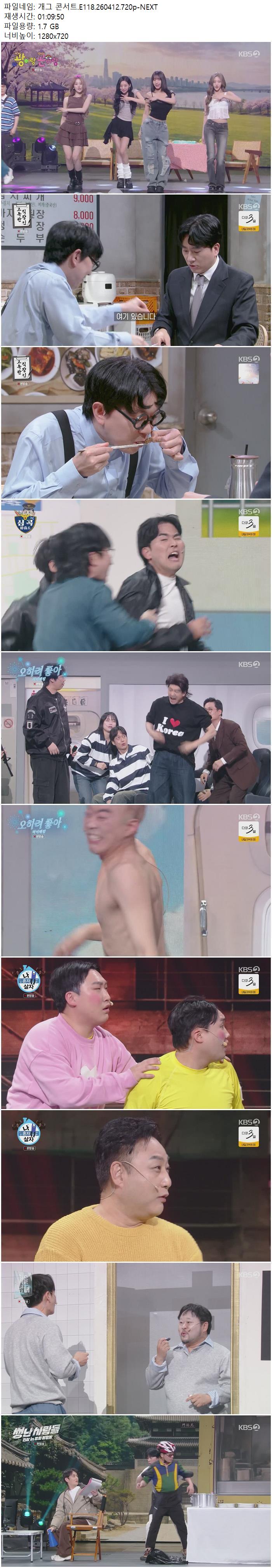 | 개그 콘서트.E118.260412.720p-NEXT.mp4 | 1.7 G | 01:09:50 | 1280x720 |