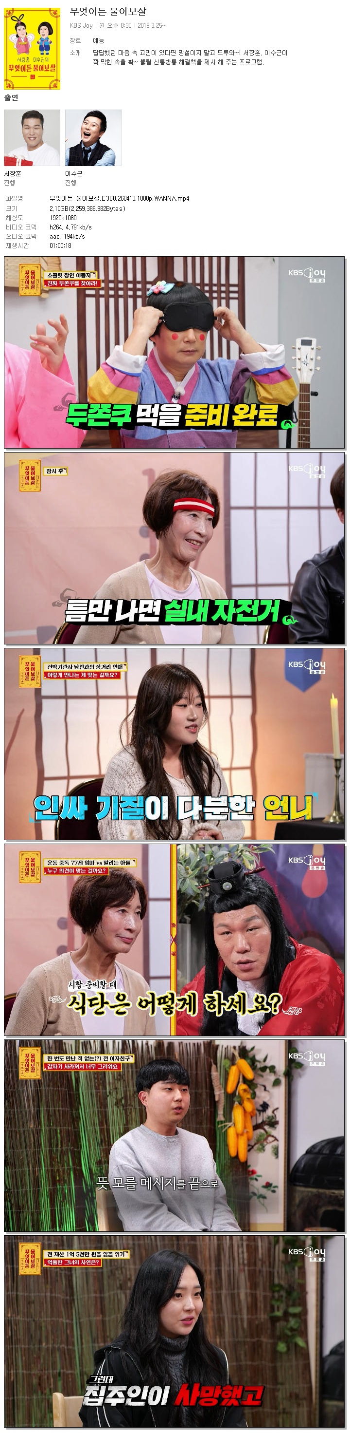 | [KBS JOY] 무엇이든 물어보살.E360.260413.1080p.WANNA[서장훈, 이수근].mp4 | 2.1 G | 01:00:18 | 1920x1080 |