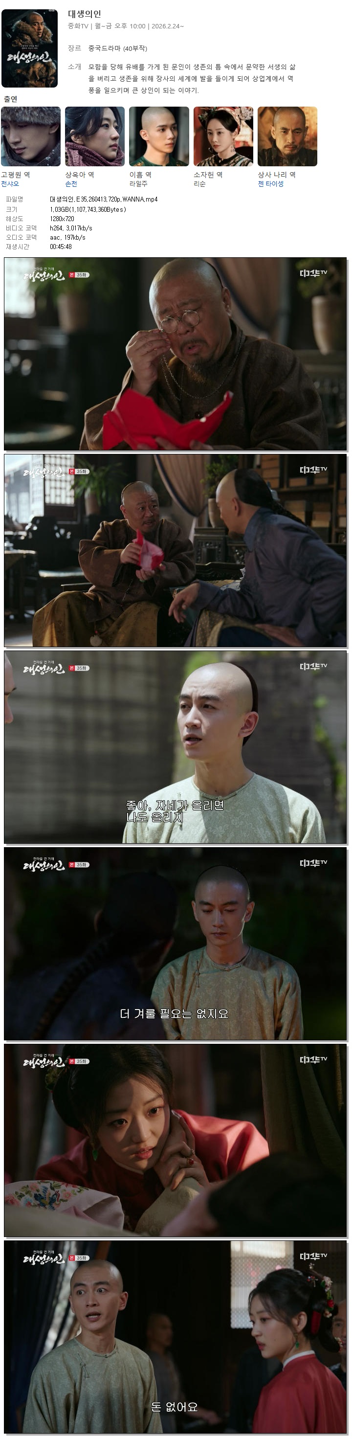 | [중화TV] 대생의인.E35.260413.720p.WANNA[천샤오, 손천].mp4 | 1 G | 00:45:48 | 1280x720 |