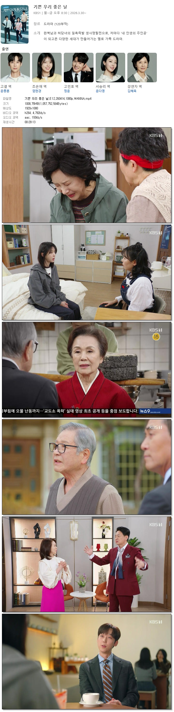 | [KBS1] 기쁜 우리 좋은 날.E12.260414.1080p.WANNA[윤종훈, 엄현경].mp4 | 1008.8 M | 00:28:13 | 1920x1080 |