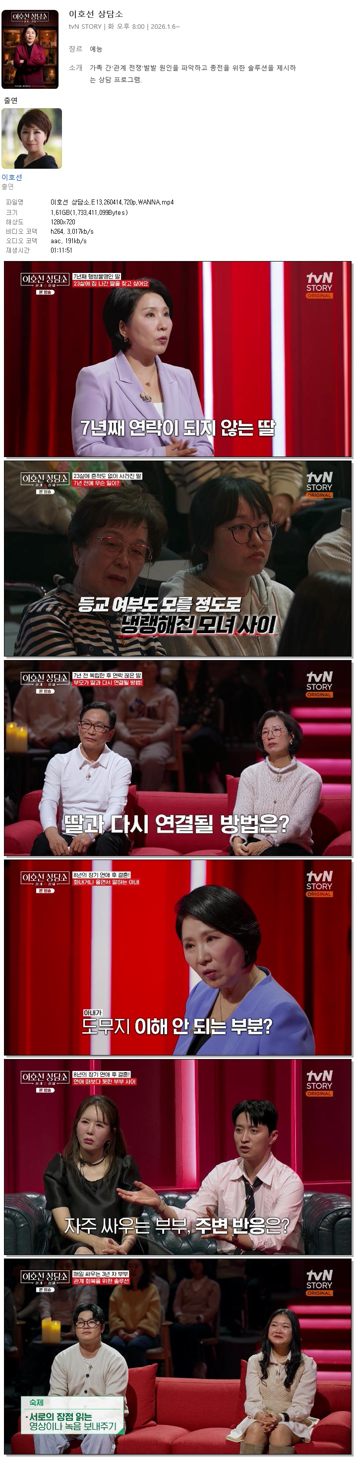 | [TVN STORY] 이호선 상담소.E13.260414.720p.WANNA[이호선].mp4 | 1.6 G | 01:11:51 | 1280x720 |