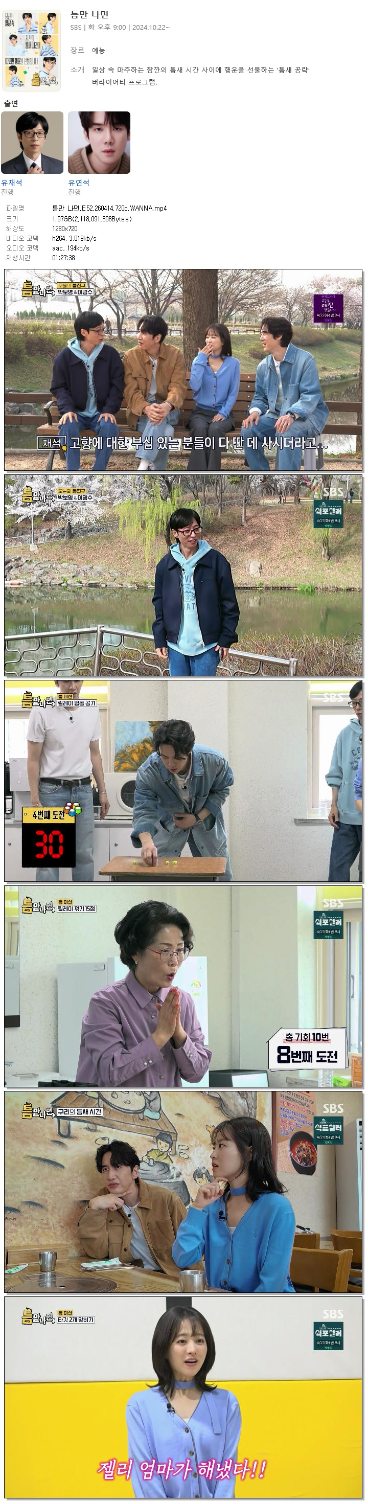 | [SBS] 틈만 나면.E52.260414.720p.WANNA[박보영, 이광수].mp4 | 2 G | 01:27:38 | 1280x720 |