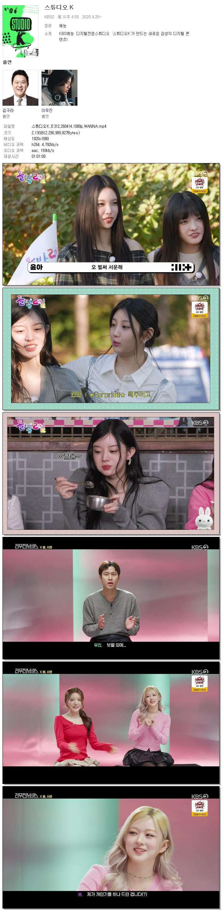 | [KBS2] 스튜디오K.E312.260414.1080p.WANNA.mp4 | 2.1 G | 01:01:09 | 1920x1080 |