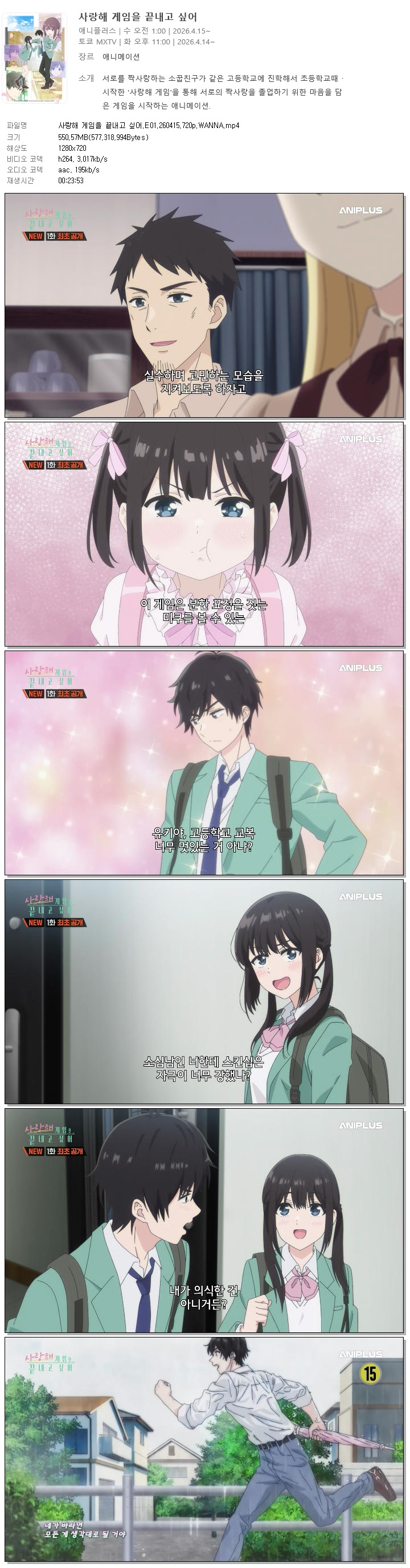 | 사랑해 게임을 끝내고 싶어.E01.260415.720p.WANNA.mp4 | 550.6 M | 00:23:53 | 1280x720 |