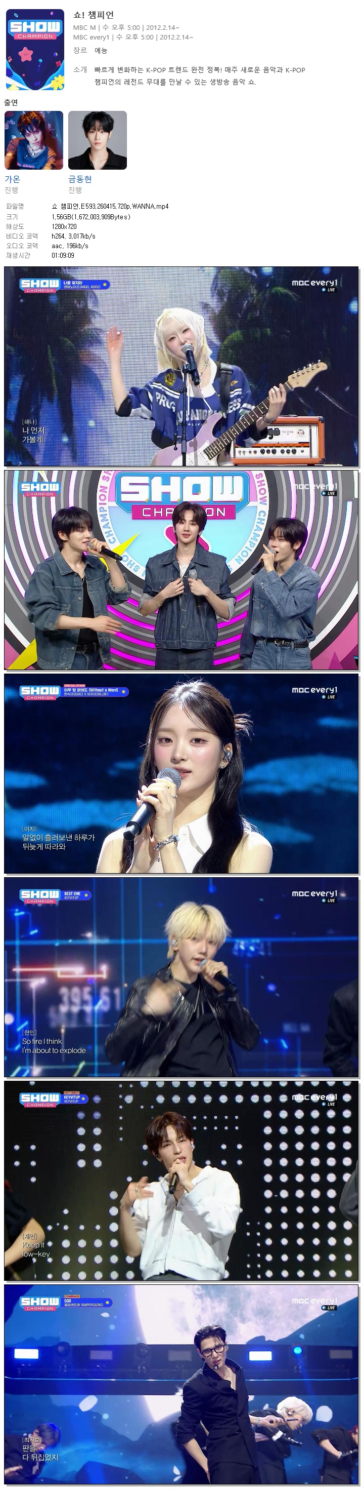 | [MBC Every1] 쇼 챔피언.E593.260415.720p.WANNA[다영, 킥플립].mp4 | 1.6 G | 01:09:09 | 1280x720 |