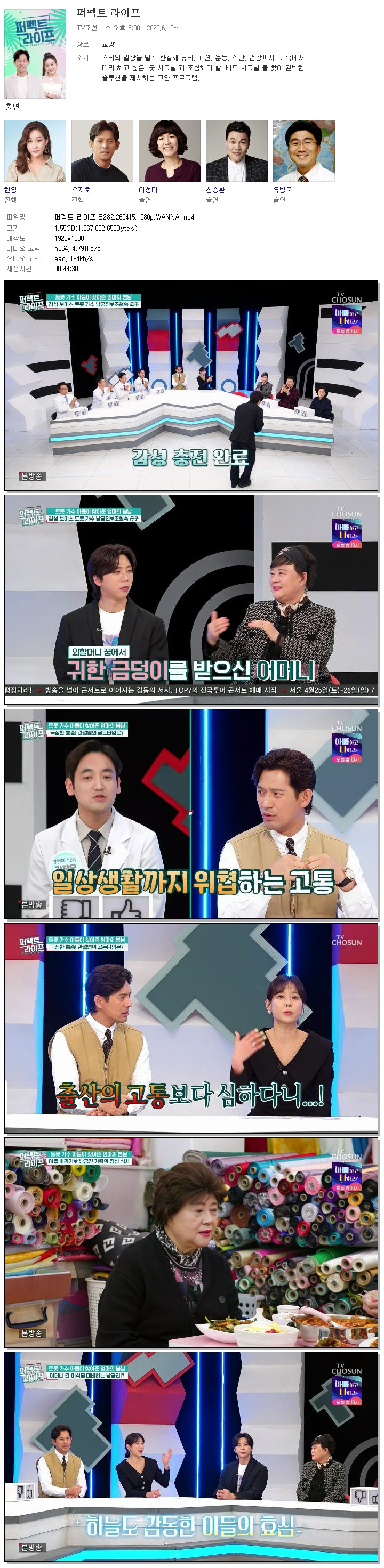 | [TV조선] 퍼펙트 라이프.E282.260415.1080p.WANNA[오지호, 현영].mp4 | 1.6 G | 00:44:30 | 1920x1080 |