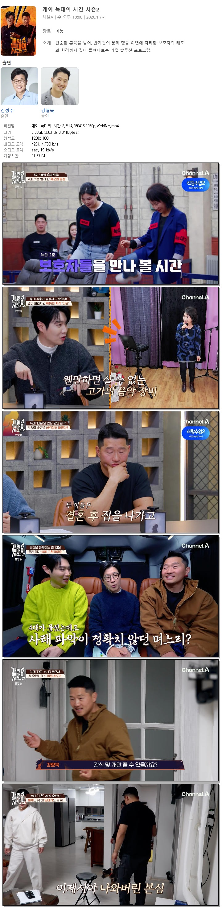 | [채널A] 개와 늑대의 시간 2.E14.260415.1080p.WANNA[김성주, 강형욱].mp4 | 3.4 G | 01:37:04 | 1920x1080 |