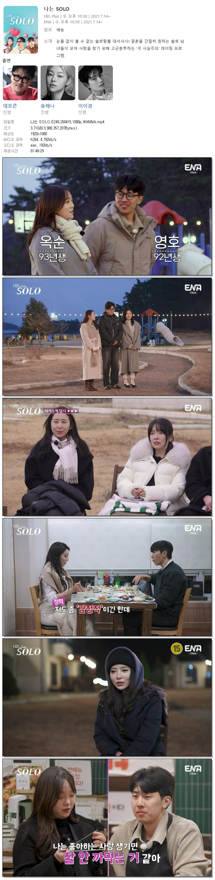 | [ENA] 나는 SOLO.E249.260415.1080p.WANNA[송해나, 이이경].mp4 | 3.7 G | 01:46:29 | 1920x1080 |