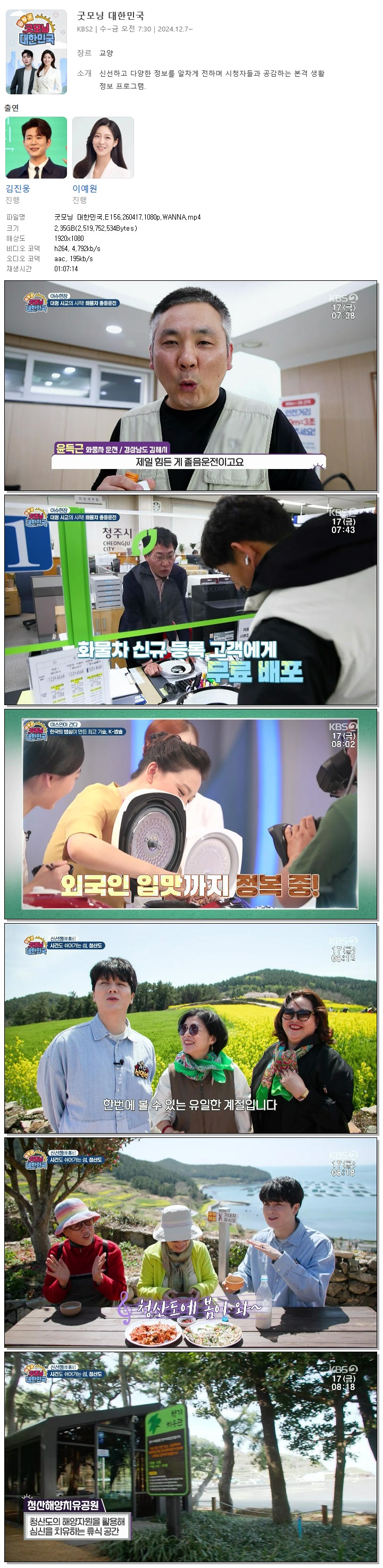 | [KBS2] 굿모닝 대한민국.E156.260417.1080p.WANNA[김진웅, 이예원].mp4 | 2.3 G | 01:07:14 | 1920x1080 |